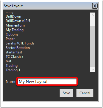 3. Pre-Built Layouts allow you to choose from either one of several layouts that come with TC2000. To find out more about these layouts go to this article: