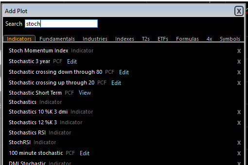 To add a plot (like an indicator) to the chart, press the forward diagonal (/) key on your keyboard then start typing the name of the indicator.