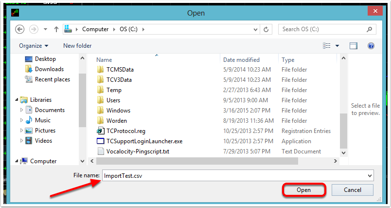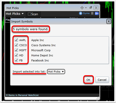 TC2000 accepts text (.csv and .txt), Excel and Word files. Symbol tickers only no other data items will be imported.