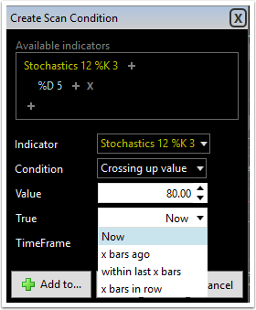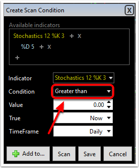 Plotted indicators can be used to create a variety of conditions (behaviors). This example uses Stochastics, but the same concept can be applied to any technical or fundamental indicator.