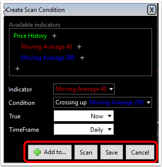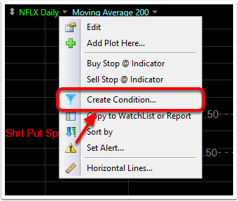 Plotted indicators can be used to create a variety of conditions (behaviors). In this example price and a moving average are used to create a crossover condition. The same steps will work for crossover conditions on any indicator. Here are the steps.