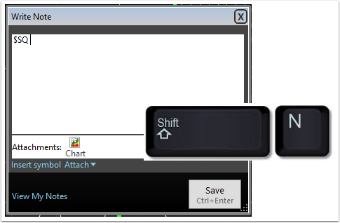 - The ticker symbol (with the $ sign). Creates a live link so that the note automatically appears anytime the symbol is selected. Also, click on the symbol in an existing Note to make that stock the active symbol.