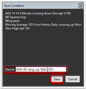 When creating conditions from charted indicators saving to the library allows for reuse of the condition for Filters, Sorting, Data Grids, etc. Here are the steps to saving any condition created on a chart. Note: Saving should be done as the condition is being created.