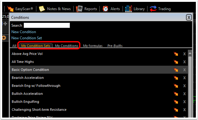 To add the saved condition to any chart, as a column, in a Data Grid, etc., click the EasyScan menu button and choose My Conditions.
