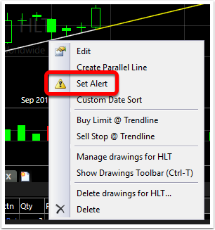 Alerts can be set on price points, trendlines, EasyScans, indicator conditions and even as reminders. There are pop-up and audio alerts within the software. Alert email and text messages are also available. Premium service allows you to set 100 concurrent alerts, Premium+ allows you to set 1000 concurrent alerts.