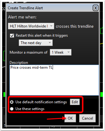 When clicking on Trendline in the Alerts ribbon menu or Alert Console (New Alert), user is instructed to draw a trendline and set alert from that trendline (according to the steps outlined above. These steps are the only way to set a Trendline Alert.)