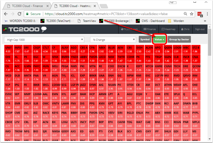 Click any symbol in the heat map to change the active symbol in TC2000 to that selected symbol.