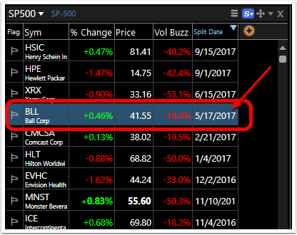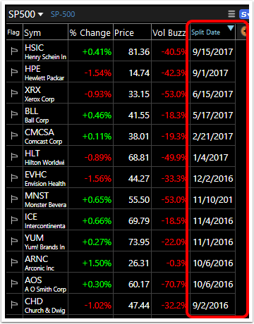 Click on any symbol in the WatchList to see the Split Dates displayed for that symbol (if/where applicable)