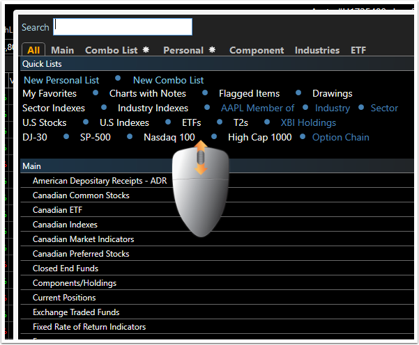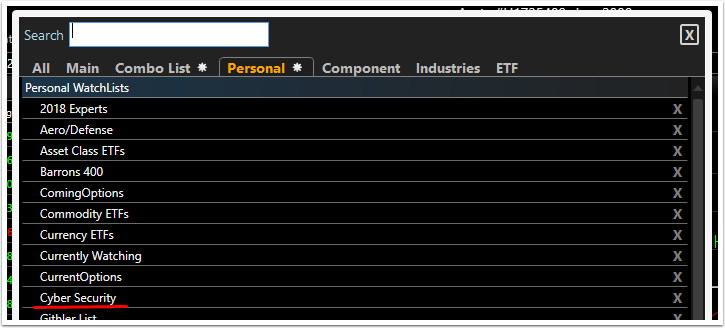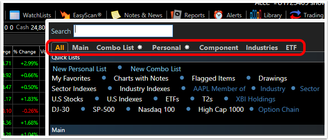 To narrow the WatchList menu to a certain group of WatchLists, click on the correct Tab in which the desired WatchList is contained.
