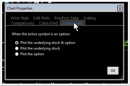 This changes the main price plot on the chart from the underlying stock to the option contract selected but only when an option (not a stock symbol) is selected..