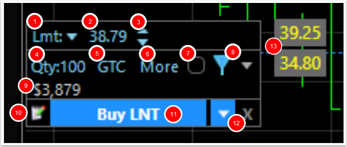 In the on-chart order ticket, the spinner next to the limit basis field can also be used to adjust limit price.
