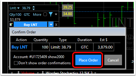 This places the On-Chart Order Ticket at the left of the chart with the fields pre-filled based on the user-defined default buy ticket. If no changes are desired, simply click Buy {Sym} and confirm to place the order.