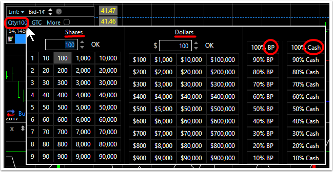 Click the Qty button to choose the desired quantity for the order. Quantity can be set on any one of these four basis: