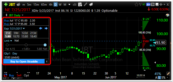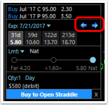 Buying a straddle is a multi-legged, high volatility, long options play profitable when a stock moves significantly in either direction. These options extend from the purchase date to the selected expiration date. Below are the steps to place an order from the chart to buy a straddle.