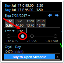 The Limit slider shows the spread between the natural (in this case, the ask) and the far (in this case, the bid). To set a price (net premium) within the spread at which to place your order, click at any point on the slider. The limit value is seen in the price field next to the "Lmt" order type.
