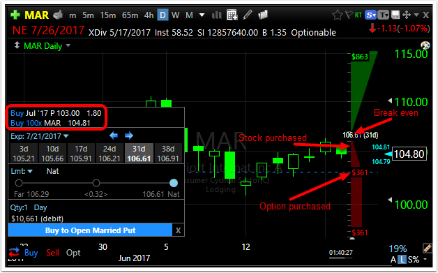 Stock + Married Put: This stock/option combination is created when a Put(s) is bought and the equivalent amount of stock is purchased simultaneously. The stock owned covers the option(s) bought. The option creates a hedge (a max loss) against a falling stock price through the option expiration date. The position provides unlimited potential gain while limiting loss to the premium minus the strike price.