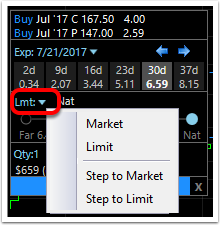 Another way to take advantage of the spread is the Step to Limit order. Choose the Step to Limit order from the drop down menu. (A Step to Market order acts the same as a Step to Limit order except that if no preferable fill is achieved during the step period, the order then moves to the Market price.)