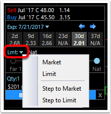 Another way to take advantage of the spread is the Step to Limit order. Choose the Step to Limit order from the drop down menu. (A Step to Market order acts the same as a Step to Limit order except that if no preferable fill is achieved during the step period, the order then moves to the Market price.)