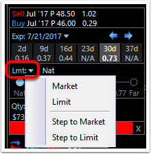 Another way to take advantage of the spread is the Step to Limit order. Choose the Step to Limit order from the drop down menu. (A Step to Market order acts the same as a Step to Limit order except that if no preferable fill is achieved during the step period, the order then moves to the Market price.)