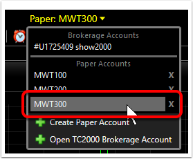 The trading tools work on either a LIVE brokerage account or a PAPER (simulated) trading account. Live market trading requires an account with TC2000 Brokerage (www.TC2000Brokerage.com).