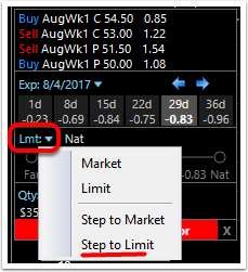 Another way to take advantage of the spread is the Step to Limit order. Choose the Step to Limit order from the drop down menu. (A Step to Market order acts the same as a Step to Limit order except that if no preferable fill is achieved during the step period, the order then moves to the Market price.)
