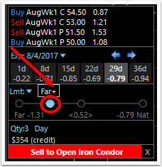 The Limit slider shows the spread between the natural (in this case, the ask) and the far (in this case, the bid). To set a price (net premium) within the spread at which to place your order, click at any point on the slider. The limit value is seen in the price field next to the "Lmt" order type.