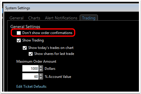 Order confirmations are the final step in submitting orders. Each confirmation gives the user a chance to review the order before submitting it. Turning off the order confirmations removes one step from placing orders and provides a more immediate order placement. Below are the steps to turn off order confirmations.