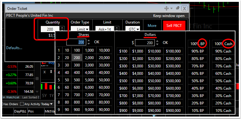 The typing fields for Shares or Dollars allow user-defined values not shown on the tables.