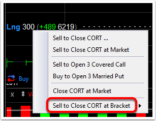 This opens a drop down menu. From this menu choose the kind of order to be attached to the position. (Sell bracket with a target/stop is used here as the illustration.)