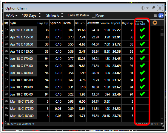 Condition column: select from a variety of saved (both system and user) criteria which can be added as a condition value to the option chain. (Examples: Above average Volume, option price below moving average, a custom PCF; etc.)
