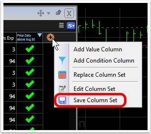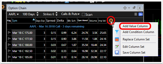 Value column: select from a variety of saved (both system and user) criteria which can be added as a simple, sortable value to the option chain. (Examples: Volume, ATR, a custom PCF; etc.)