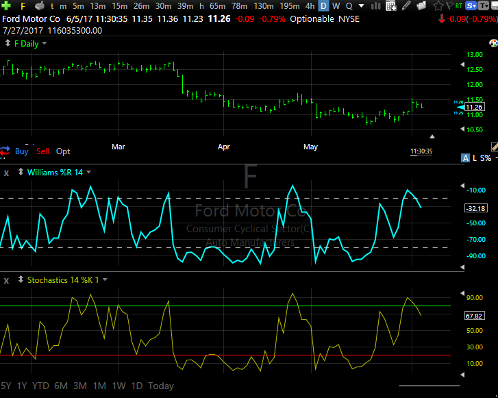 Williams Percent Range (%R) determines whether the market is overbought/oversold. Williams %R is very similar to the Stochastic Oscillator. The only difference is that %R has an upside down scale and the Stochastic Oscillator has internal smoothing. In the chart below you can see that the plots are identical but they are plotted on different scales.